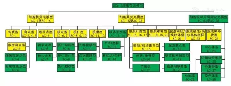 注:AC指抗細(xì)胞(anti-cell),基于抗核抗體的國際分類和命名原則,結(jié)合我國目前檢測的臨床現(xiàn)狀,建議黃色部分為必報熒光模型,綠色部分為選報熒光模型