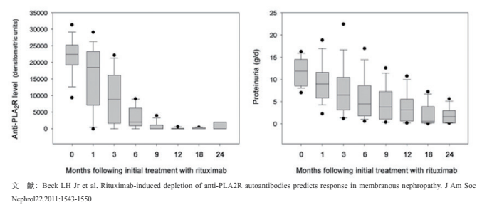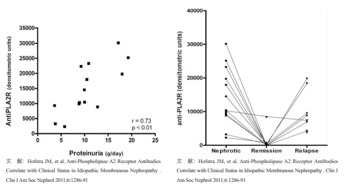 如 Beck 等人的研究表明,伴隨著利妥昔單抗治療,抗 PLA2R 抗體滴度變化與治療反應(yīng)性的響應(yīng)速度優(yōu)于傳統(tǒng)的蛋白尿指標(biāo)。