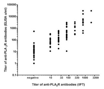 文獻(xiàn):Cornelia D?hnrich et al. Development of a standardized ELISA for the determination of autoantibodies against human M-type phospholipase A2 receptor in primary membranous nephropathy. Clinica Chimica Acta 421 (2013) 213–218