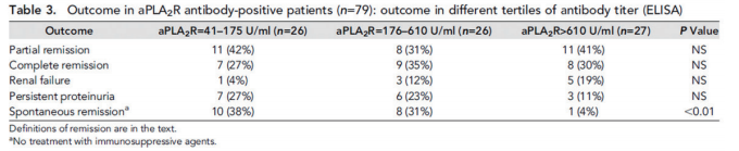 該文章同樣采用 ELISA 方法學(xué)定量檢測抗體水平(內(nèi)部自制 ELISA 試劑),文獻(xiàn)報(bào)道原發(fā)性膜性腎病患者的自發(fā)緩解率隨抗 PLA2R 抗體水平的增高而顯著降低。