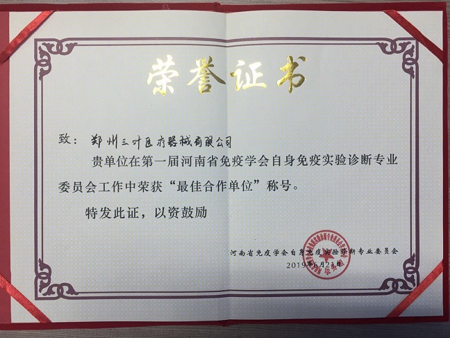 6月21日-22日,由河南省免疫學(xué)會自身免疫實驗診斷專業(yè)委員會主辦的2019年河南省免疫學(xué)會自身免疫實驗診斷專業(yè)委員學(xué)術(shù)年會在新鄉(xiāng)市開元名都大酒店成功舉辦,鄭州三葉公司本著同學(xué)習(xí)共進步的態(tài)度并以公司代理的德國歐蒙、法國SEBIA蛋白電泳等產(chǎn)品為代表進行參展,參會的專家、學(xué)者等于會人員均對我司代理的產(chǎn)品及服務(wù)給予高度評價,河南免疫學(xué)會自身免疫實驗診斷專業(yè)委員會依據(jù)我司在學(xué)會第一屆期間及以往在河南省綜合服務(wù)表現(xiàn)授予我司暨鄭州三葉醫(yī)療器械有限公司“最佳合作單位”榮譽稱號!